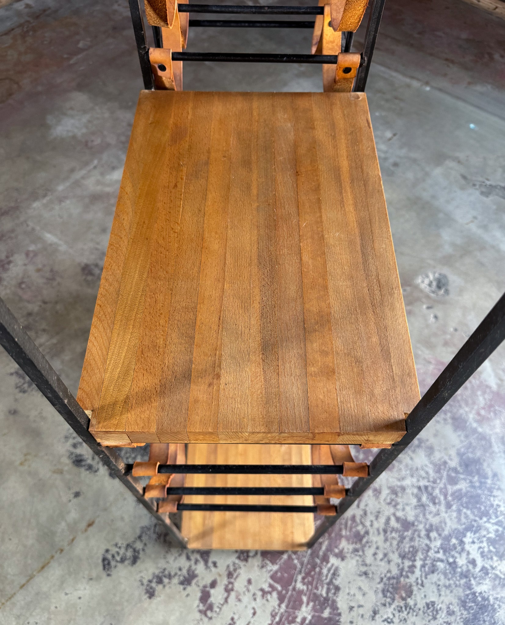 Good original condition. Patina to the iron frame and leather. Some scattered stains to the leather. Areas of discoloration to the wood. Overall presents well.