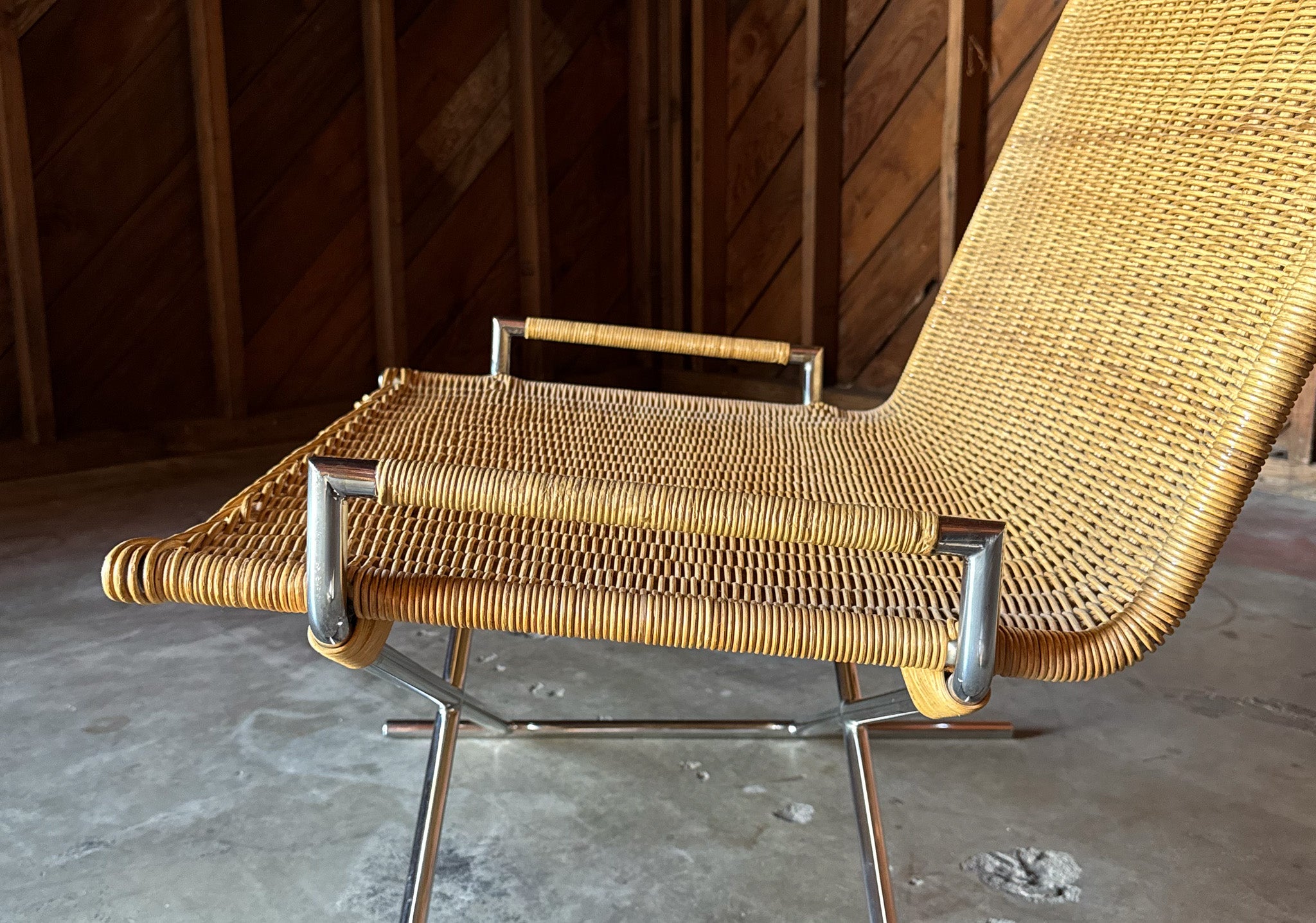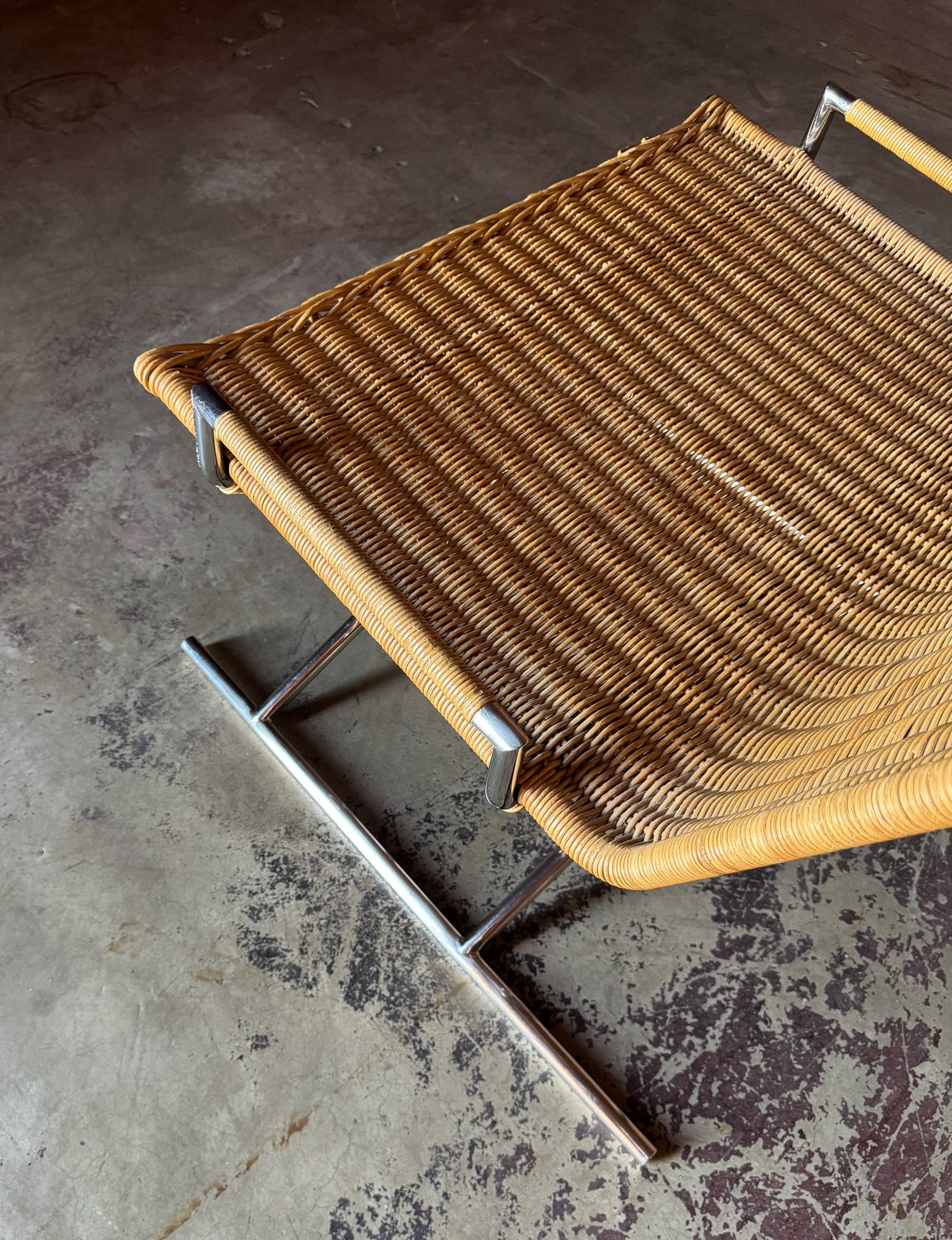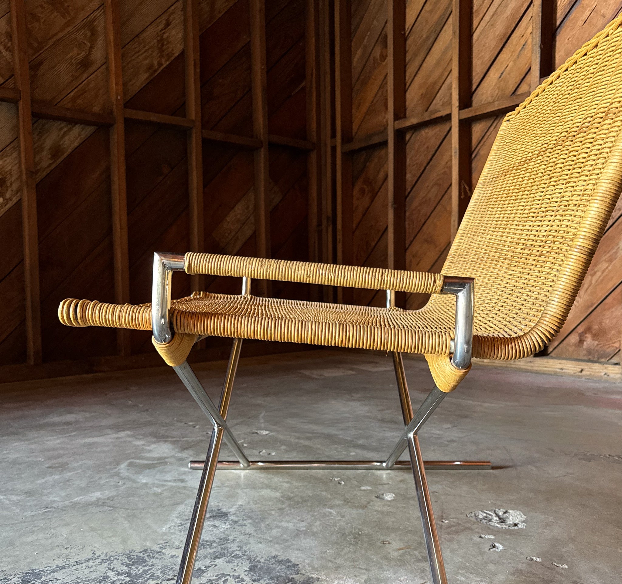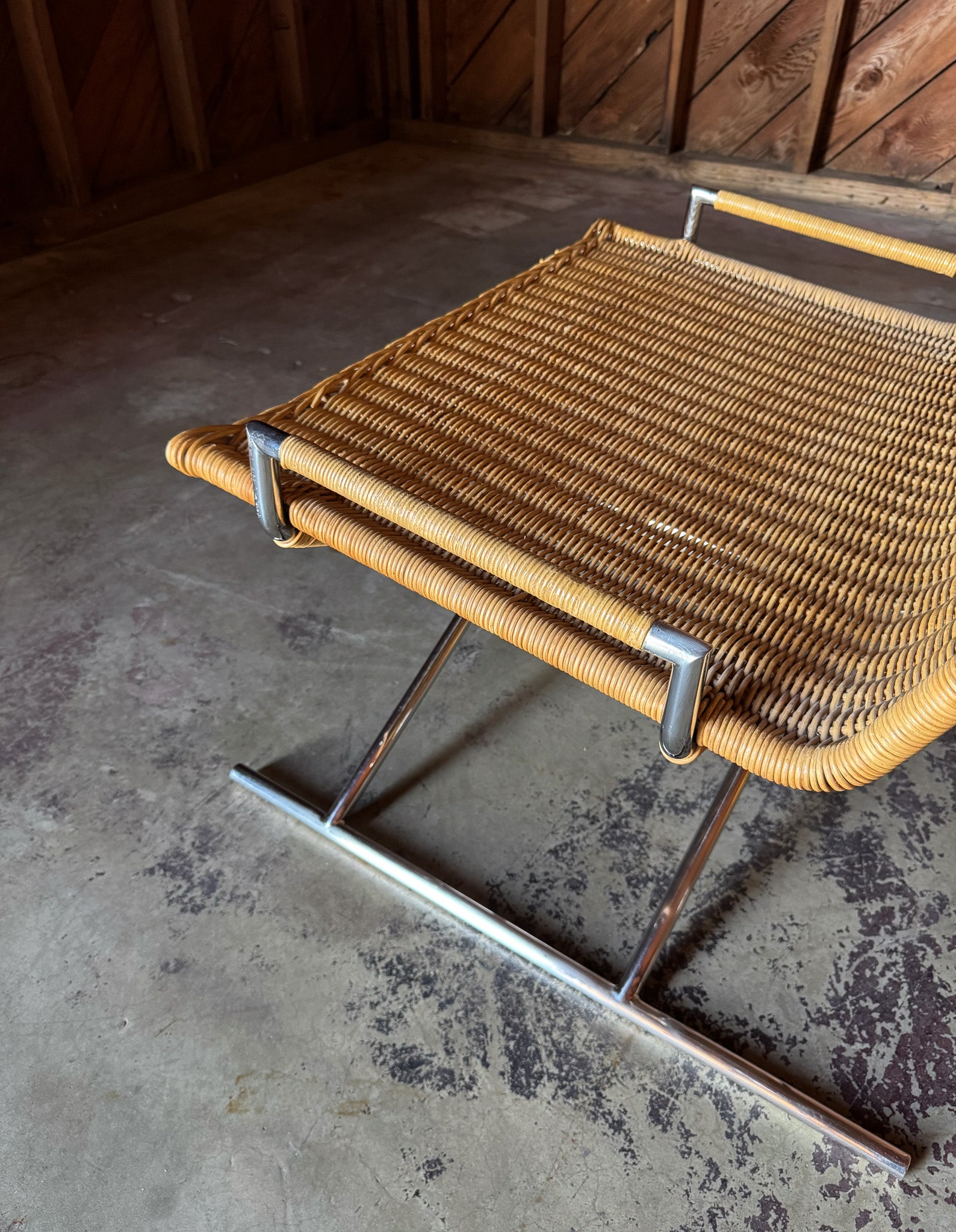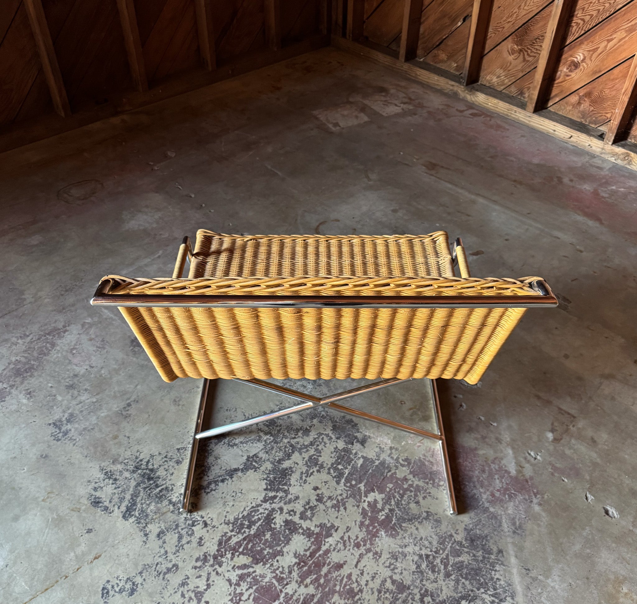 Very good original condition. Expected light patina to the steel. A couple small scattered breaks to the rattan but nothing distracting.