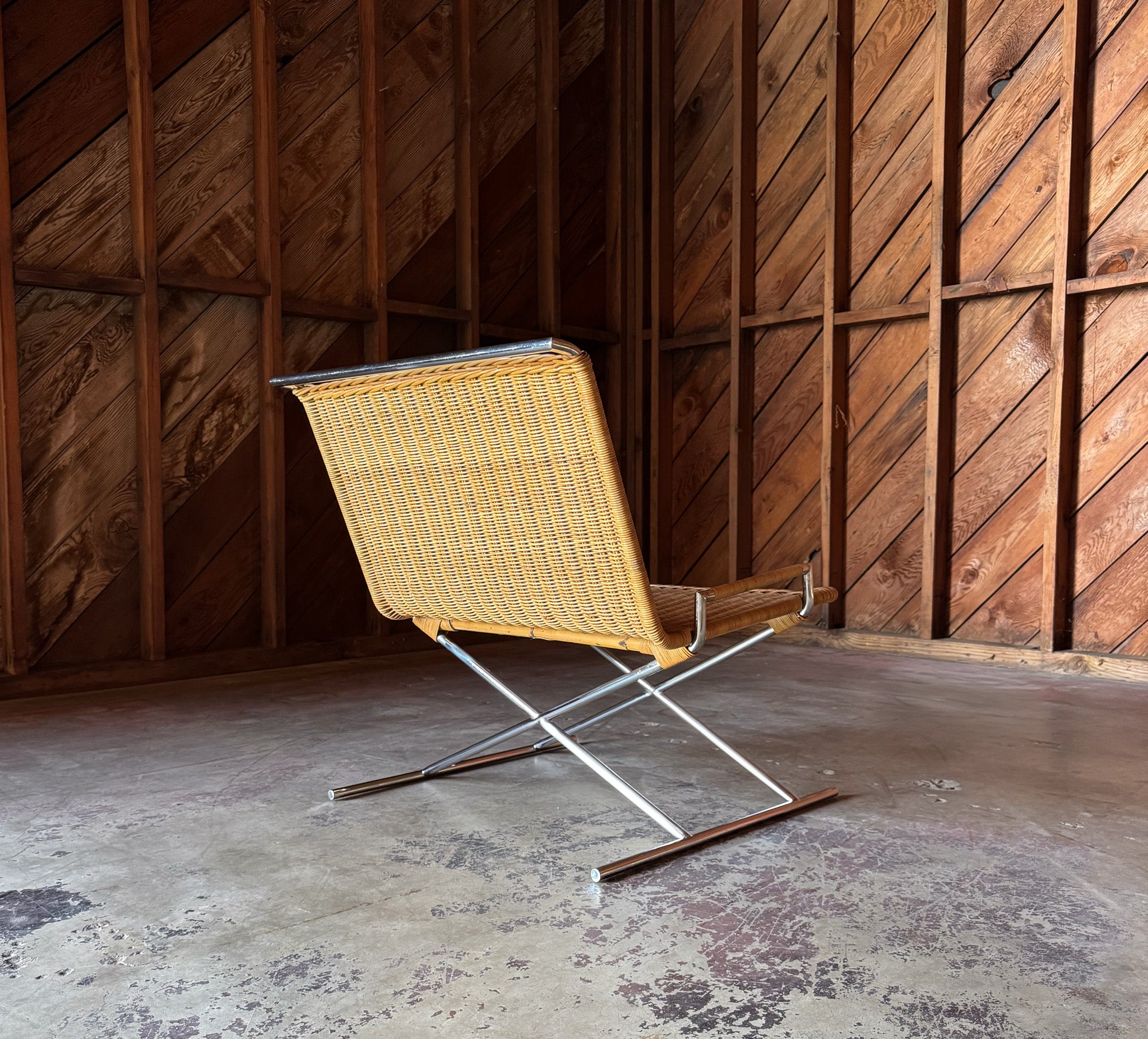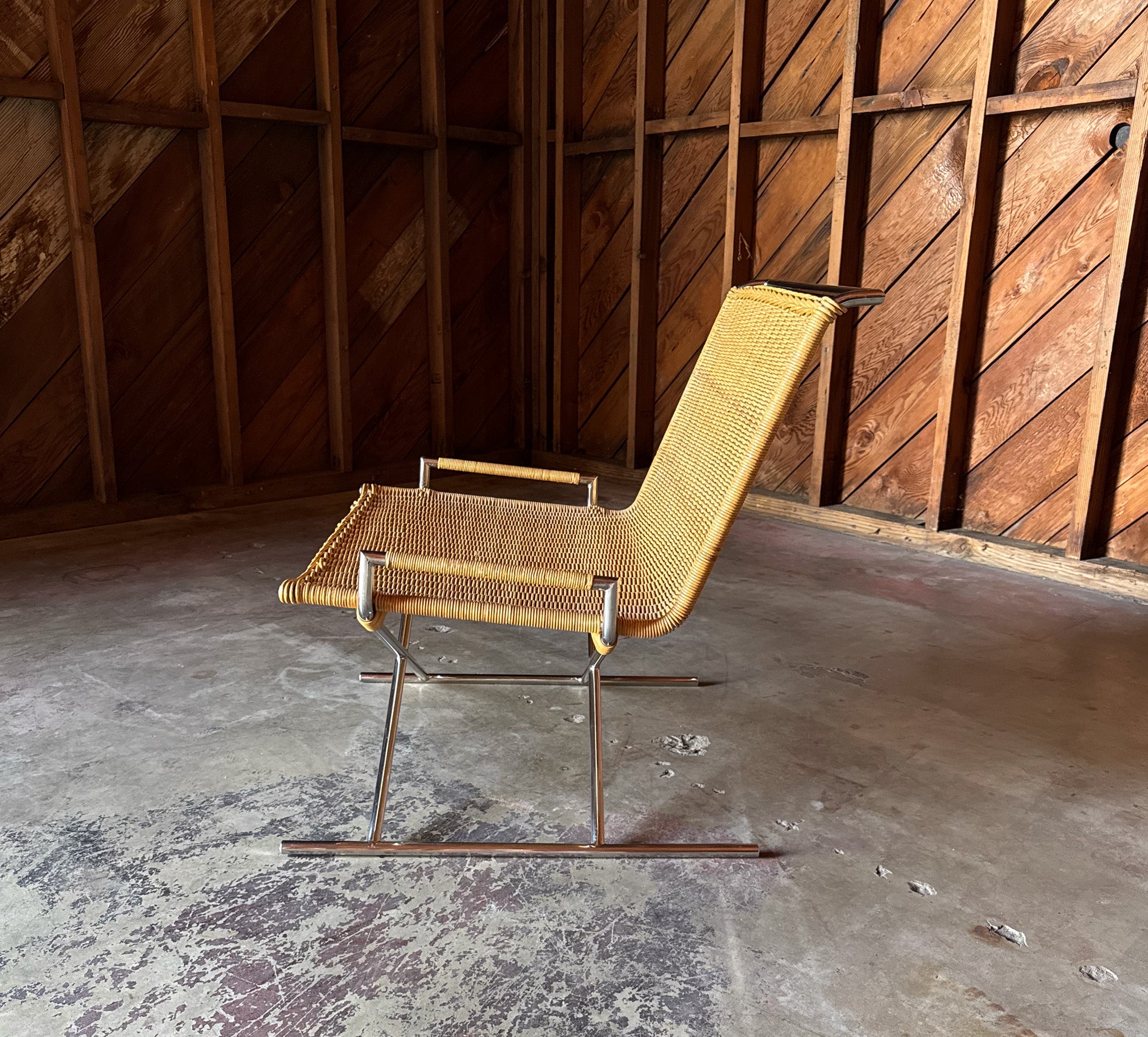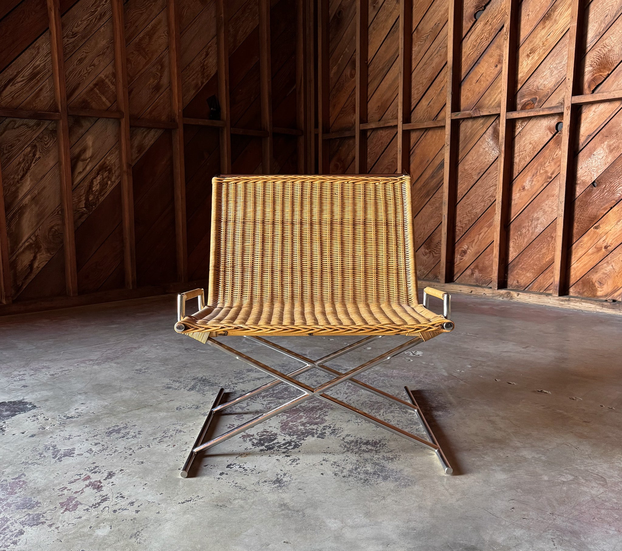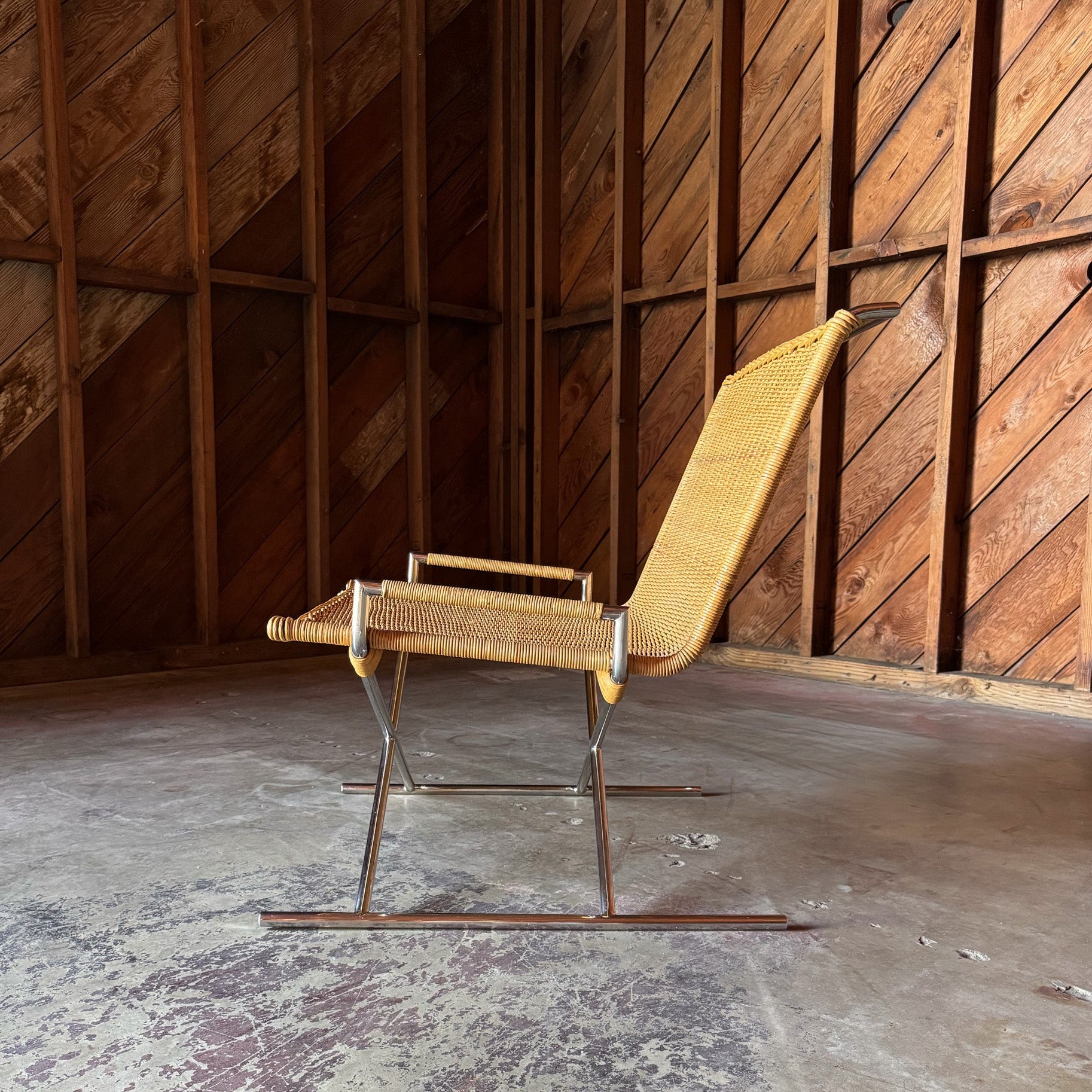 Very good original condition. Expected light patina to the steel. A couple small scattered breaks to the rattan but nothing distracting.