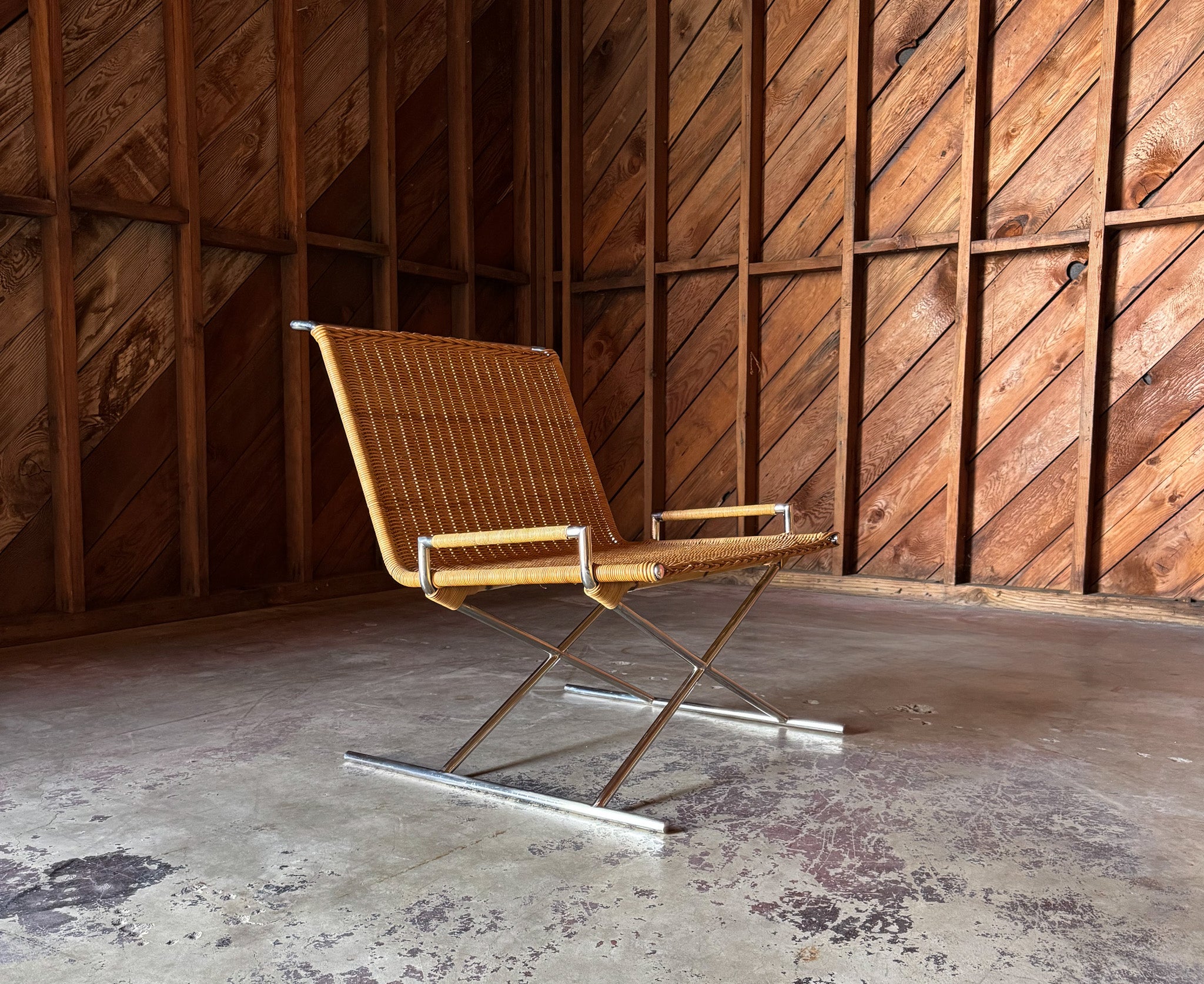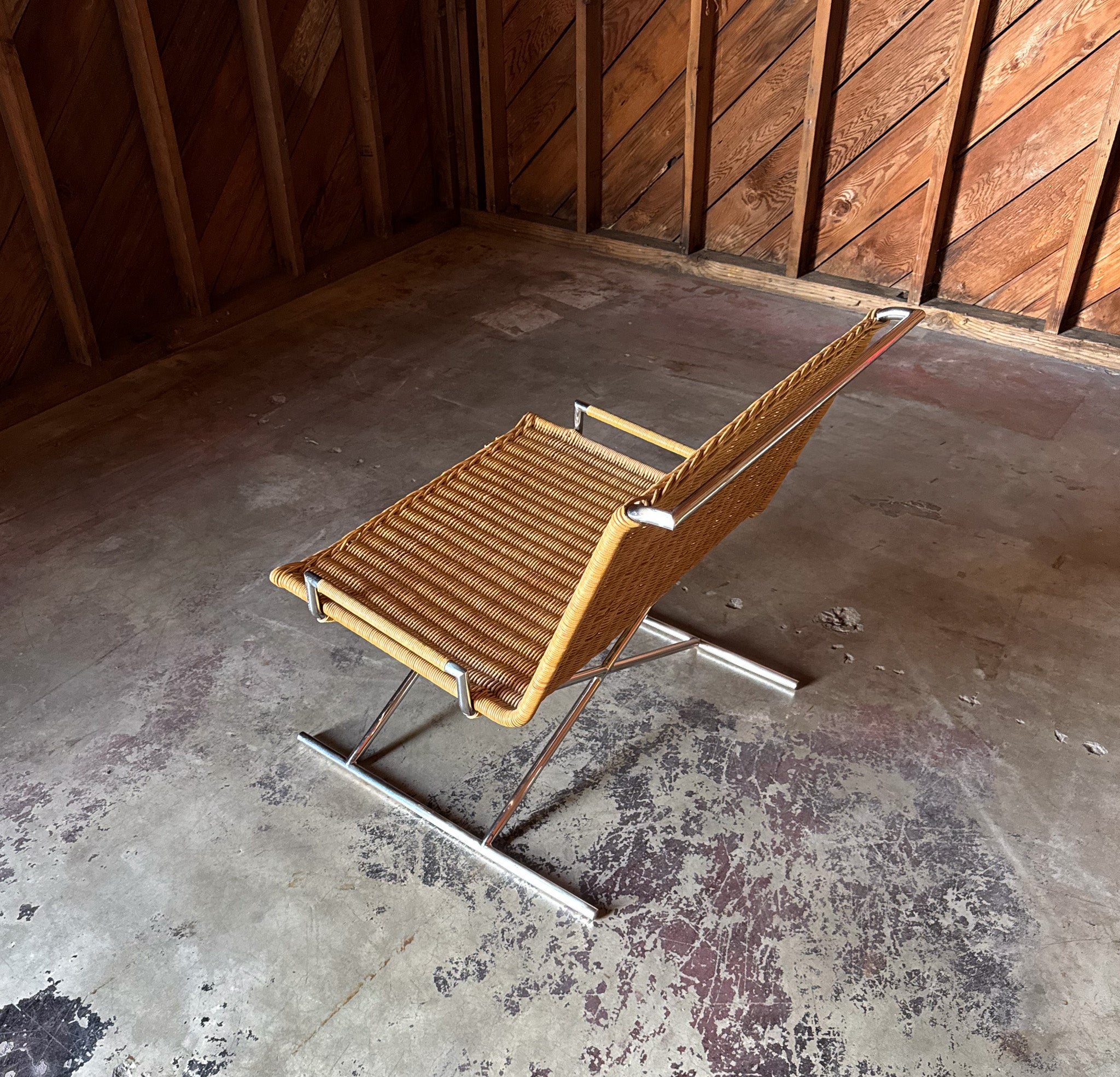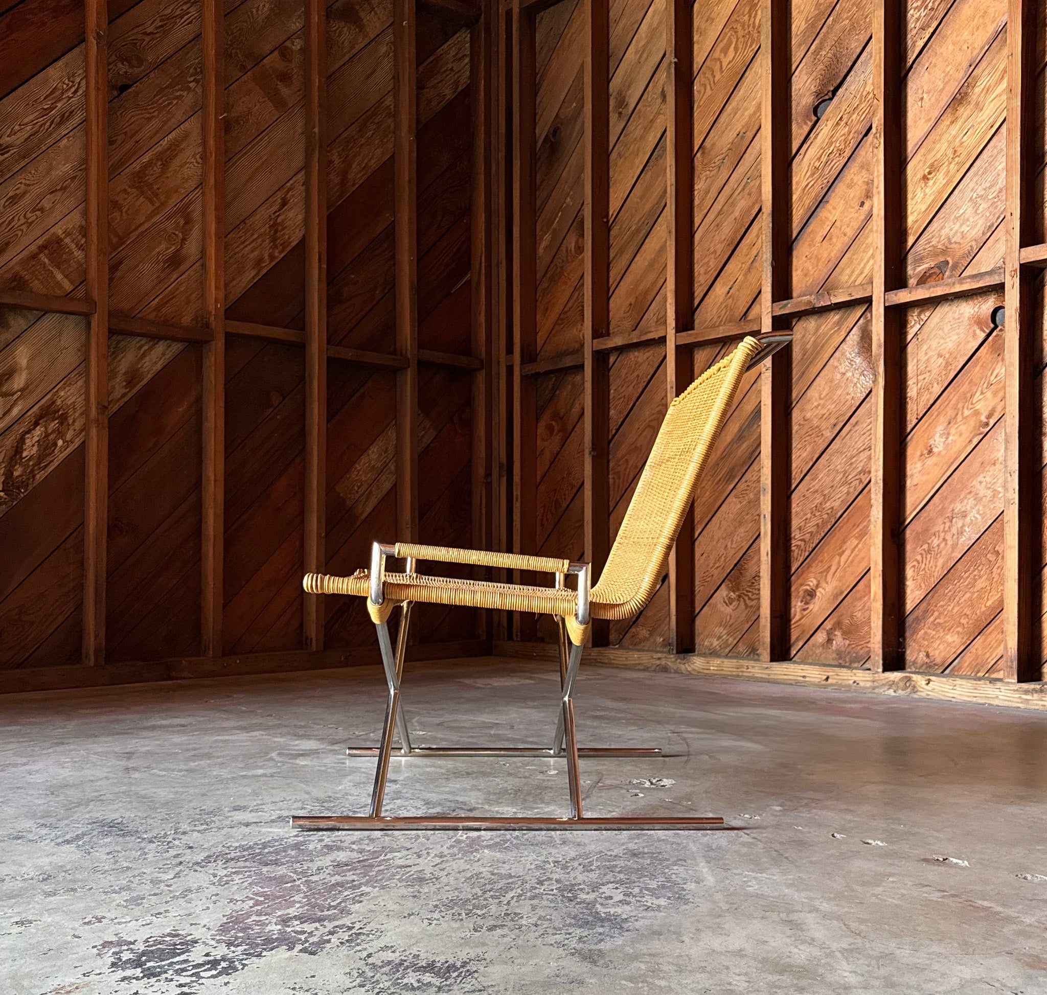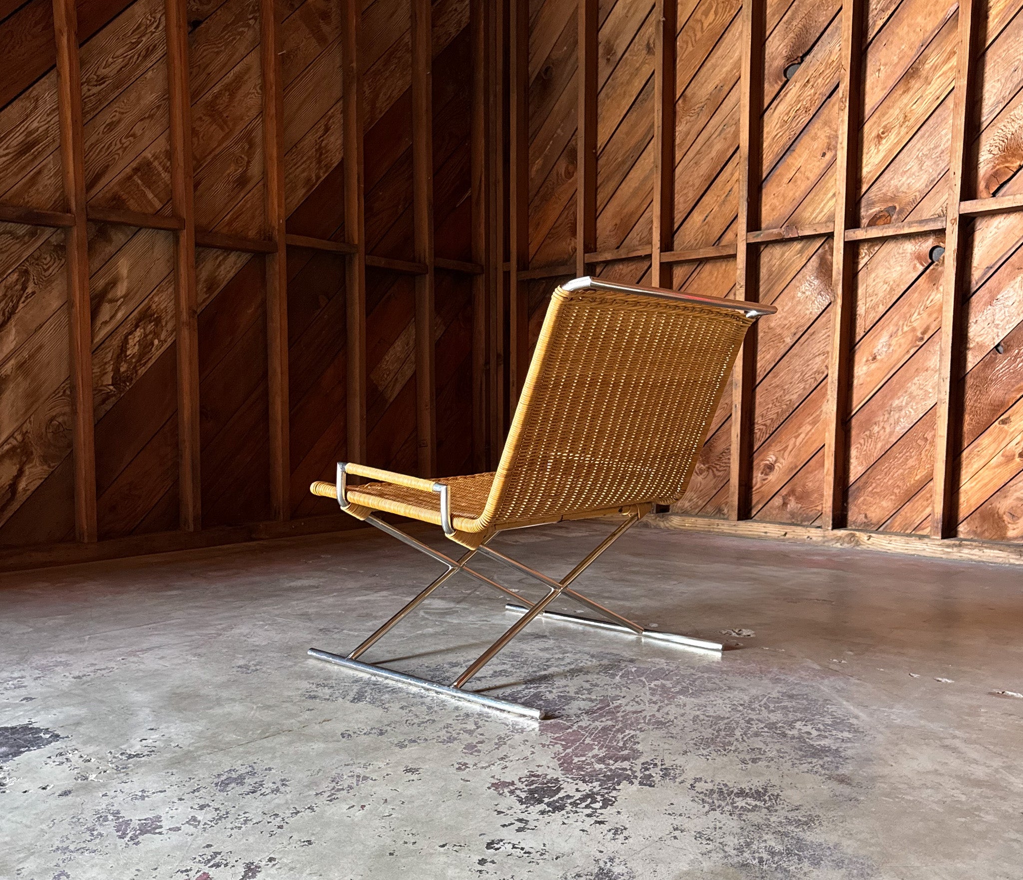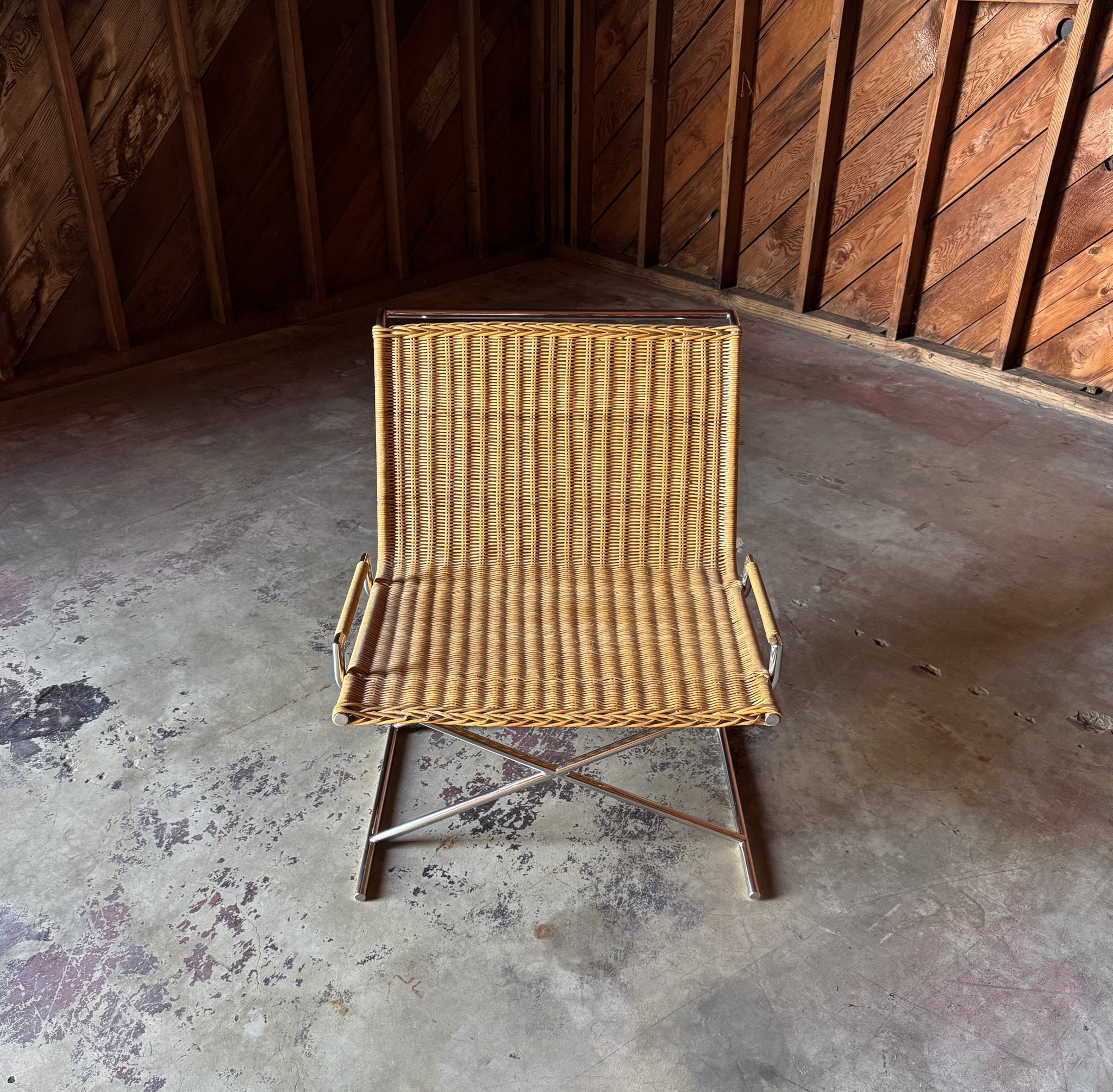 Very good original condition. Expected light patina to the steel. A couple small scattered breaks to the rattan but nothing distracting.