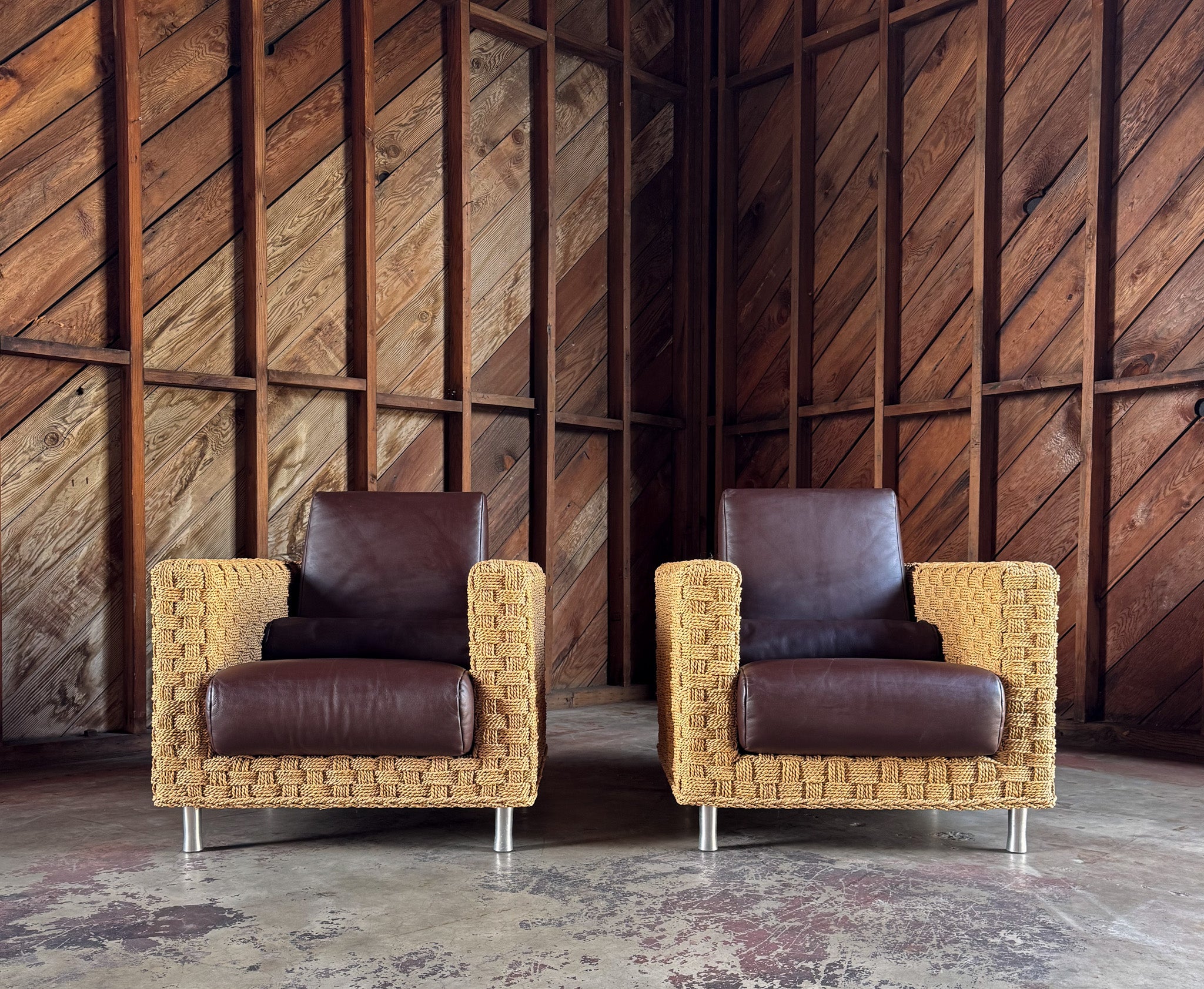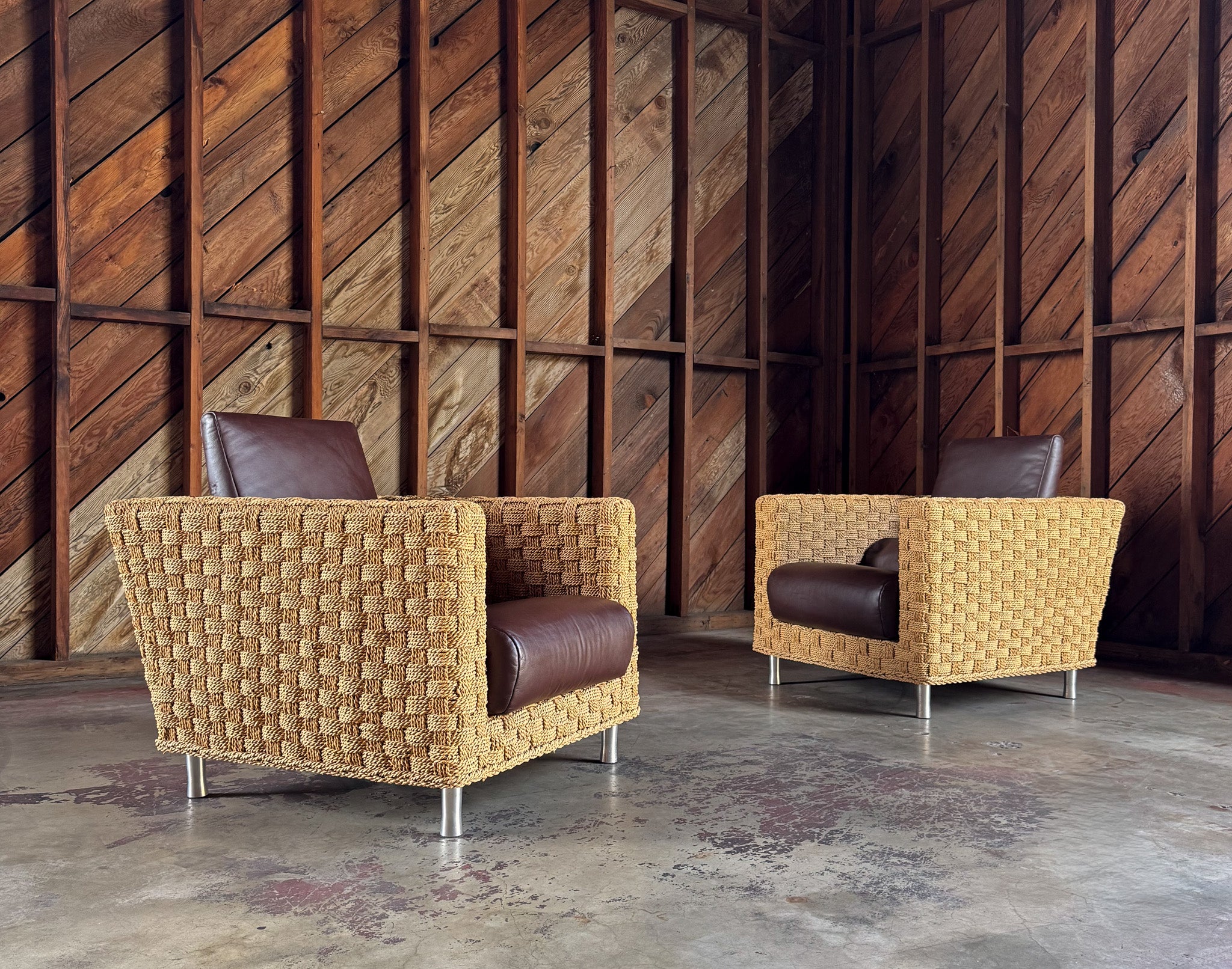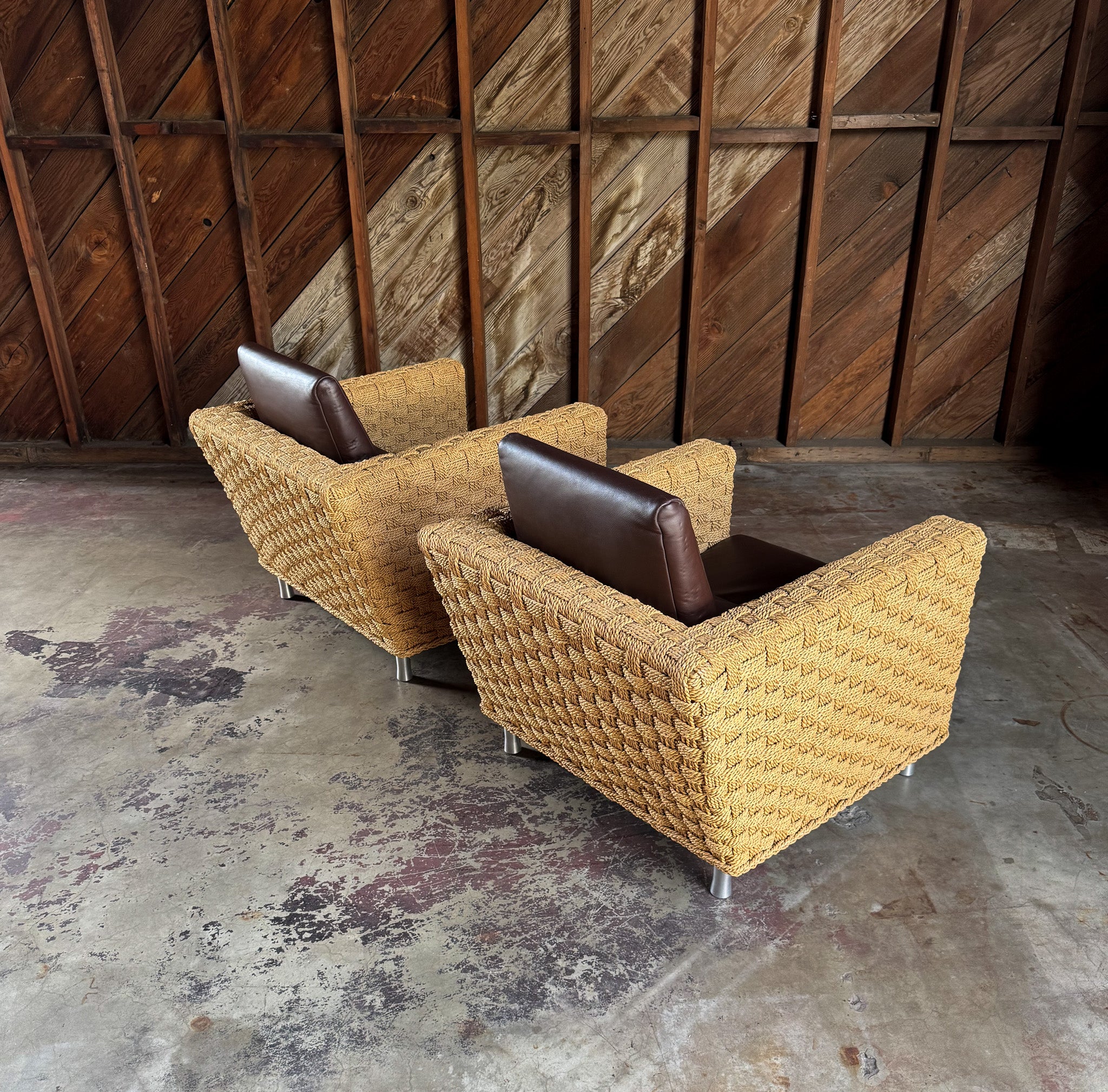 Didier Gomez Hemp & Leather " Wicky " Lounge Chairs for Ligne Roset, France, c.1995. The listed price is for the pair. ( Two pairs available. )