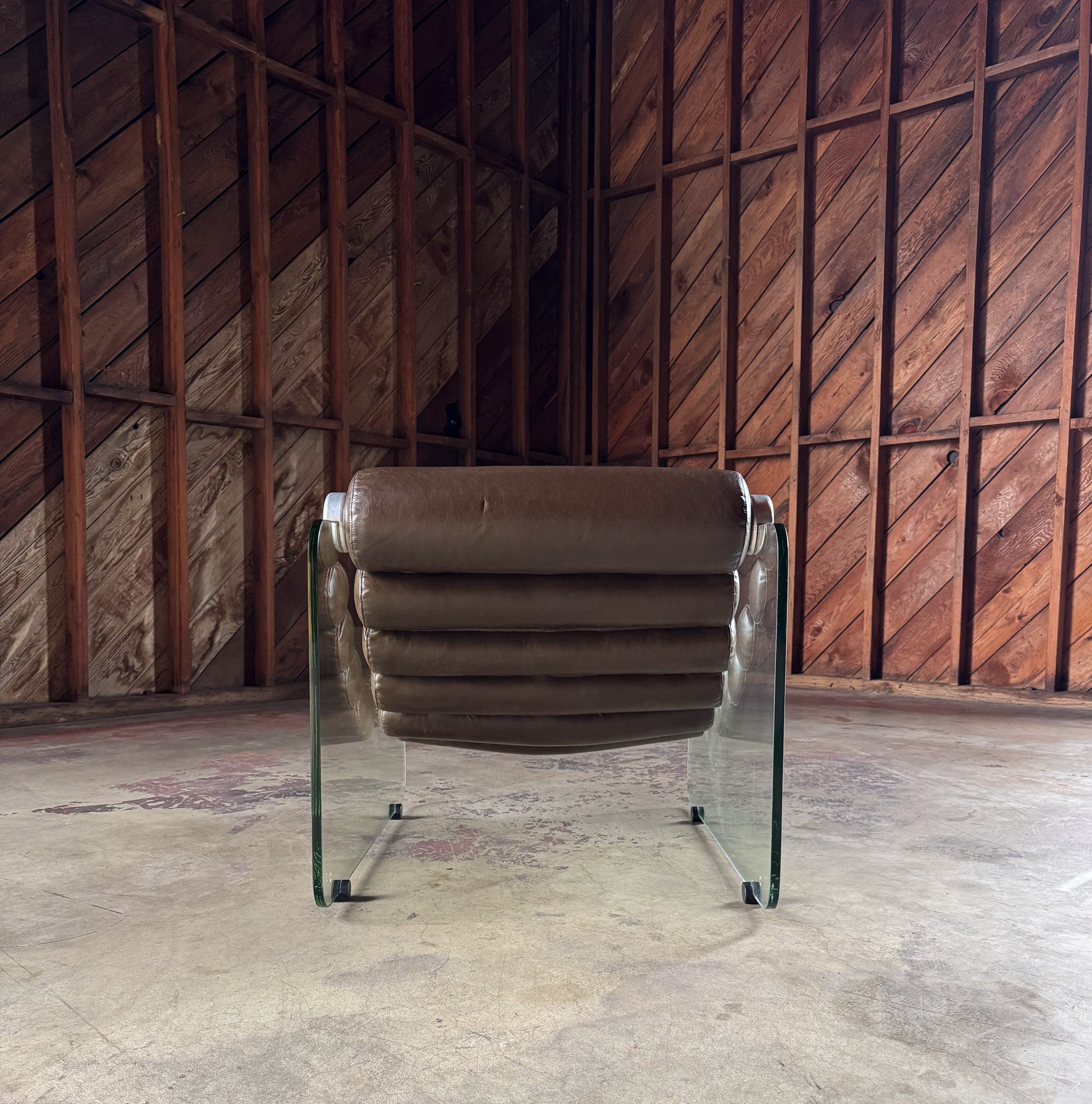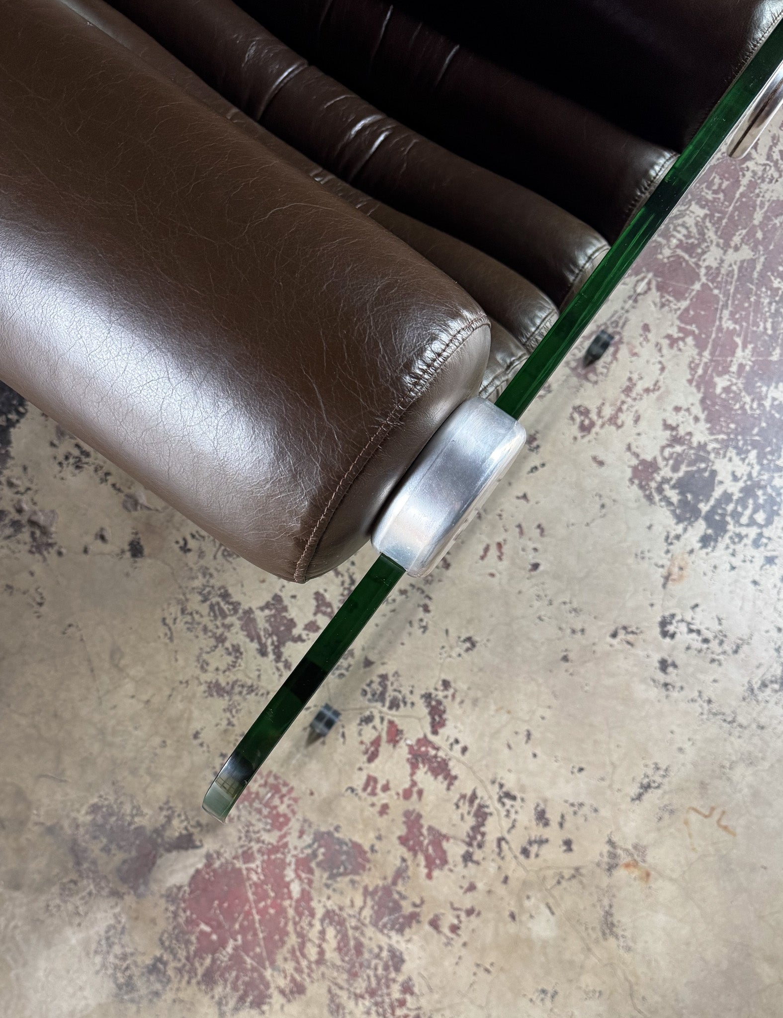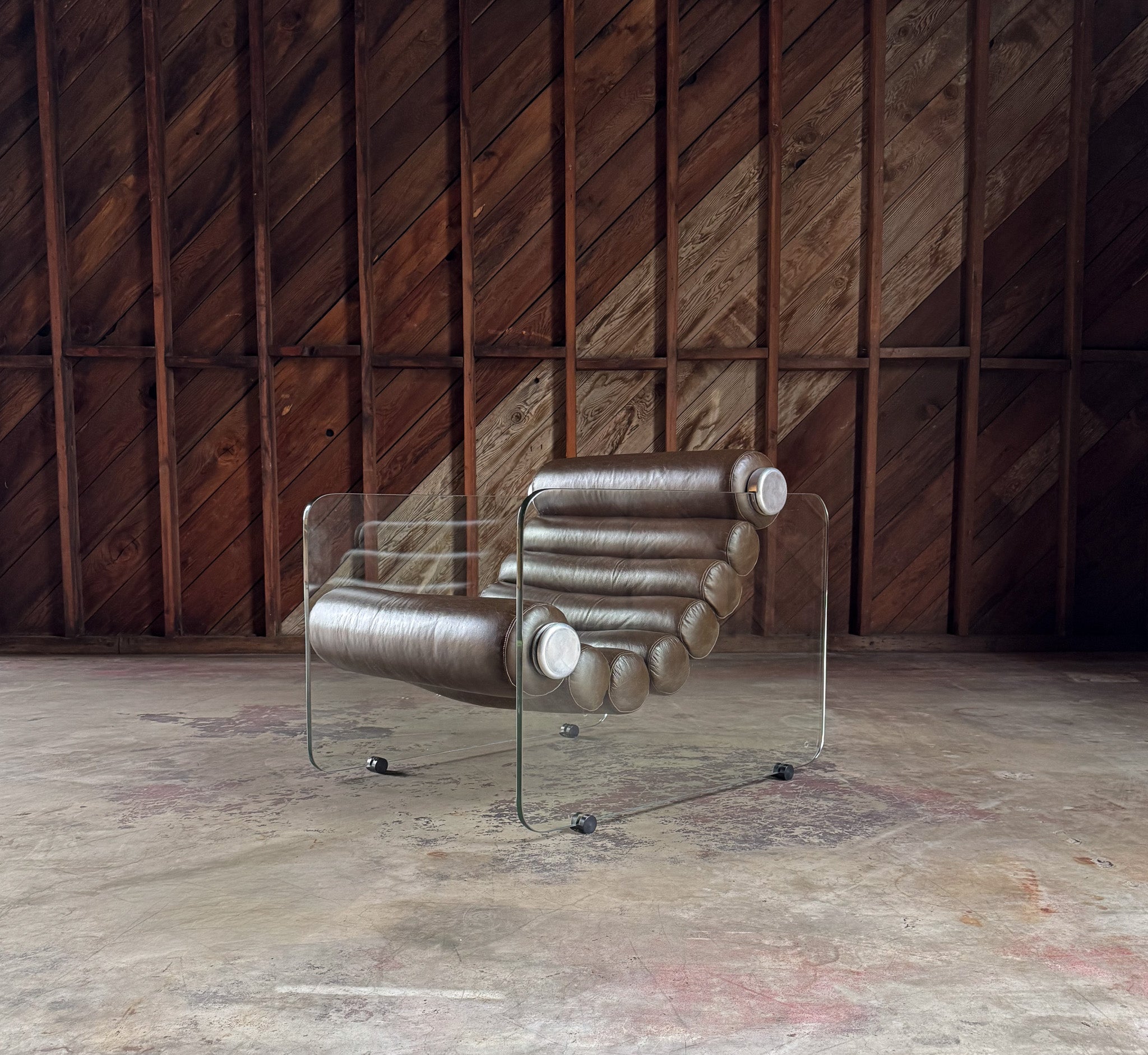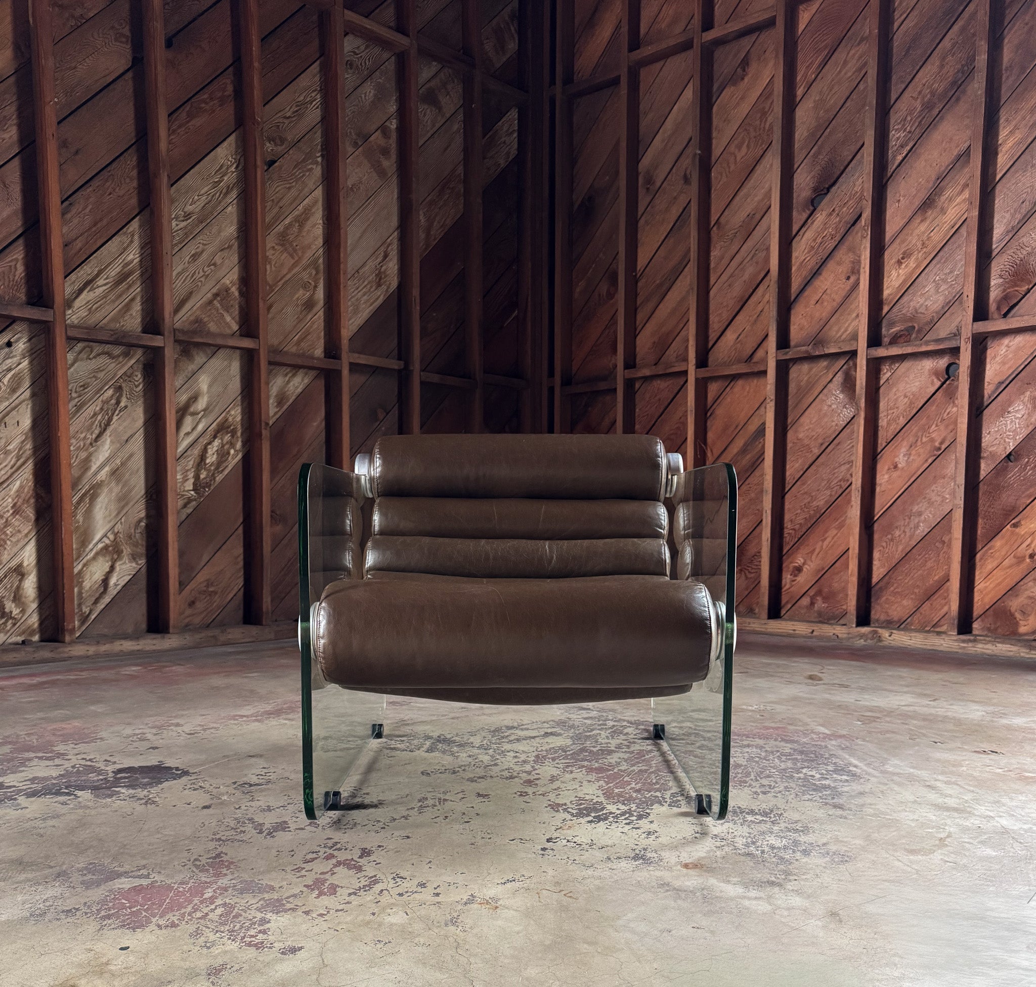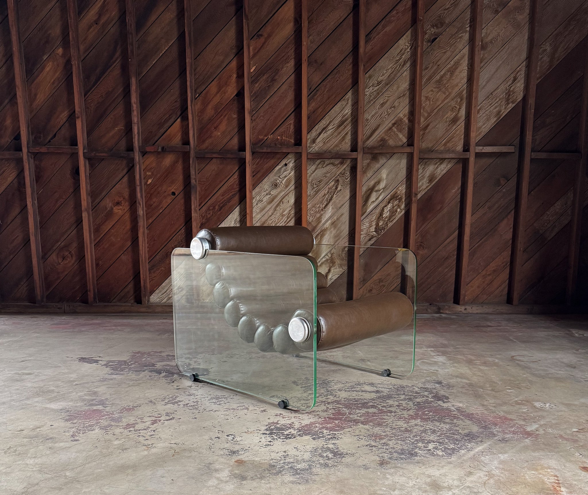 Fabio Lenci Hyaline Lounge Chair for Comfort Line, Italy, c.1970. Tempered Glass, Leather & Aluminum.